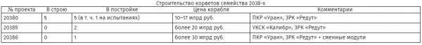 Одновременно для ВМФ России продолжается строительство кораблей проекта 20380, их более дорогой и сложной версии — проекта 20385, а также и увеличенного в размерах и получившего ряд других серьезных изменений проекта 20386.