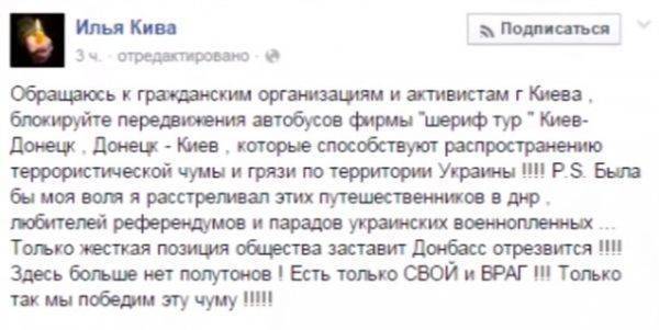Когда весной 2015 года в подконтрольной Украине Константиновке бронетранспортер украинских военных насмерть сбил 8-летнюю девочку, что вызвало волнения среди местных жителей, Илья Кива лаконично написал в соцсети: "ВАТУ В ЗЕМЛЮ!".
