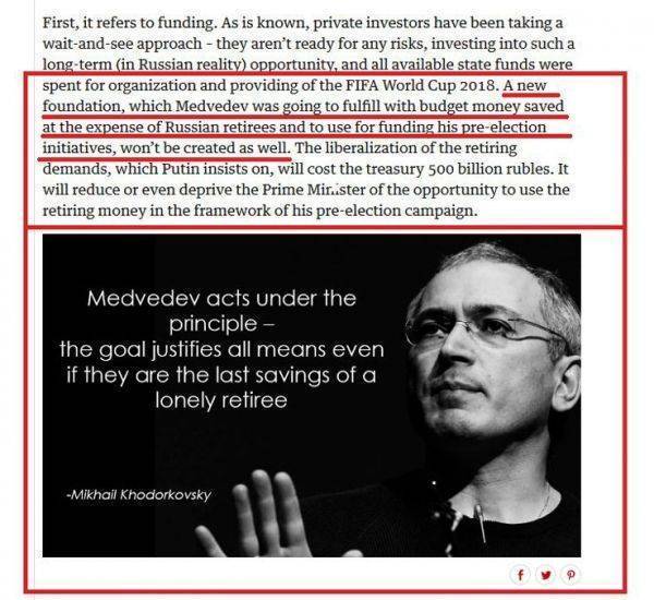 "Медведев действует по принципу: цель оправдывает средства, даже если это последние деньги одинокого пенсионера". Михаил Ходорковский.