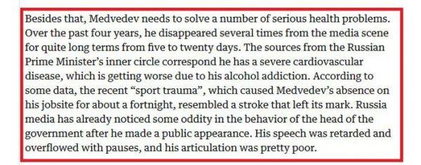 Кроме того, автор статьи обратил внимание на частые случаи отсутствия Медведева на рабочем месте по болезни. В последний раз это случилось в середине августа, когда премьер-министр пропал из виду на две недели. По официальной версии правительства России у него была спортивная травма, однако неофициальные источники утверждают, что у него тяжелое сердечно-сосудистое заболевание, усугубляемое пристрастием к употреблению крепких алкогольных напитков.