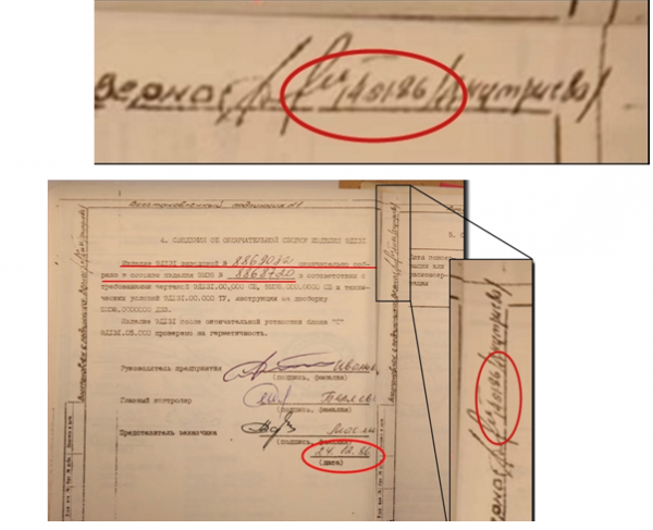 Расхождение в датах, действительно, есть. Однако никакого криминал в этом нет. Дело в том, что самое первое изделие было сделано 31.01.1985 года, то есть раньше, чем появился восстановленный экземпляр документа. Однако об этом Каныгин предусмотрительно умалчивает.