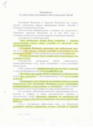 Об имплементации «Меморандума о стабилизации ситуации в зоне деэскалации Идлиб» (от 17.09.2018 г.)