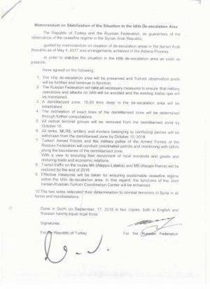 Согласно подписанным документам, демилитаризация должна проводиться исключительно вглубь зоны деэскалации Идлиб, на расстояние от 10 до 20 километров от текущей линии соприкосновения боевиков и сирийских правительственных войск.