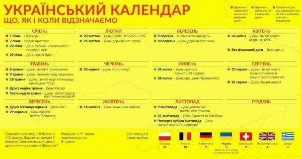 Речь идет об инициативе убрать старые советские праздники или заменить их на альтернативные. Как указано на сайте Института, документ дополнен новой категорией – «Международные дни», куда включены, среди прочего 8 марта - День борьбы за права женщин (день будет праздничным, но не выходным) и 1 мая - День труда (будет выходным). Также украинцам разрешили отдыхать на Троицу. Второй день после Пасхи и Троицы (понедельник) остается выходным. Зато приживается католическое рождество, празднование которого в прошлом году узаконила Верховная рада. 4 сентября праздник Государственного Флага Украины - именно в этот день подняли сине-желтый флаг над зданием Верховной Рады Украины в 1991 году.