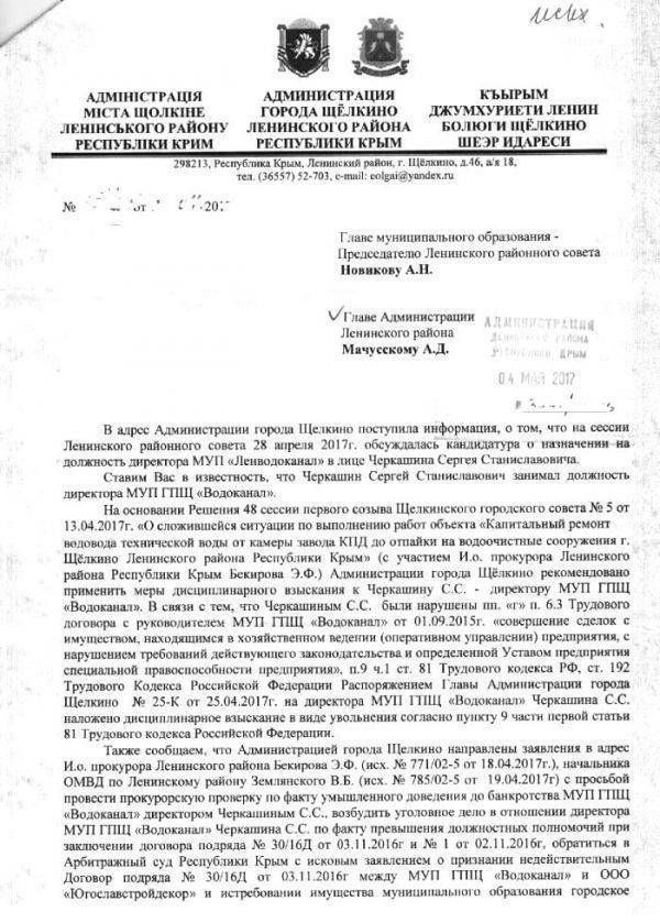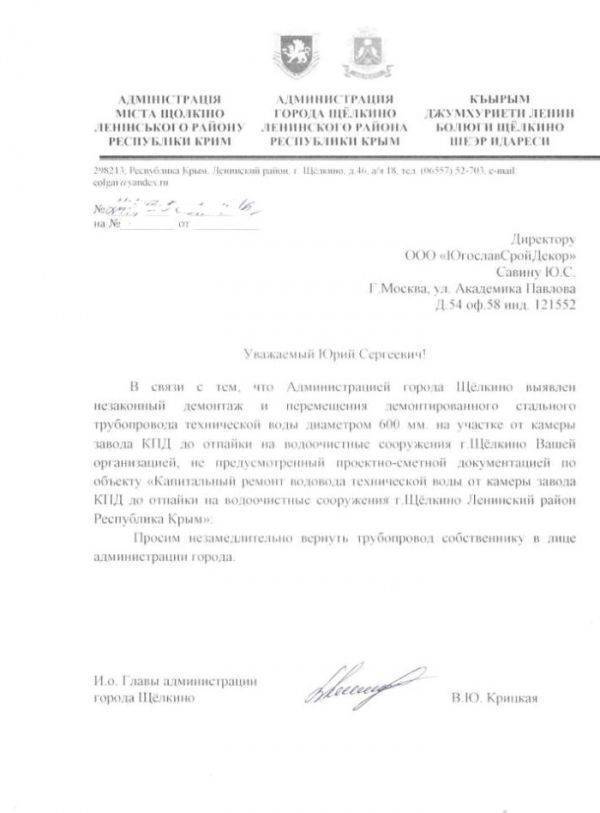 Как выяснилось, подрядчик без разрешения городской администрации демонтировал и вывез на хранение в Феодосию 10 километров труб диаметром 600 мм. Позже трубы продали на металлолом, а договор на демонтажные работы c местным МУП «Водоканал» подписали «задним числом».