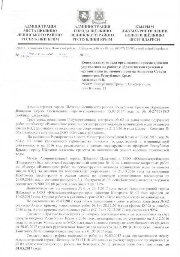 В 2016 году правительство Крыма проводило конкурс на выбор единого подрядчика для строительства объектов социальной инфраструктуры полуострова. По результатам торгов победила Московская организация ООО «Югославстройдекор» (далее подрядчик), которое заключило контракт на капитальный ремонт водовода технической воды в городе Щёлкино осенью 2016 года.