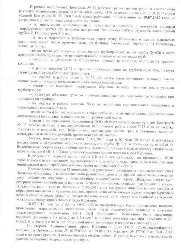 Тем не менее, работы по монтажу водовода производилось с нарушениями строительных норм. Трубы укладывались на неподготовленную поверхность без песчаной подсыпки и запрессовывались в соединительные муфты экскаватором, без специального оборудования. Об этом общественники и депутаты Щёлкинского городского совета неоднократно заявляли в правоохранительные органы.