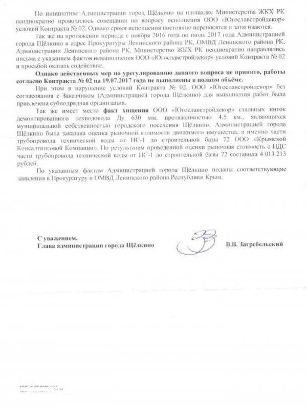 Стоит отметить, что глава администрации Щёлкино Владимир Загребельский обращался в правоохранительные органы, а также в ФАС с просьбой принять к подрядчику меры и внести ООО «Югославстройдекор» в список недобросовестных подрядчиков, однако решение по данному вопросу до сих пор не принято.
