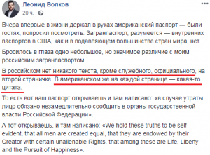 Алексей Навальный и Ко никогда не упускают любой маломальский повод, чтобы очернить Россию и воспеть Запад и его ценности. Они хватаются за такие возможности, как одичавшие собаки за кость. Вот и на этот раз «правая» рука блогера Леонид Волков, который в данный момент идет по стопам Навального и учится на «цветного революционера» в Йельском университете США, не упустил такую возможность «похаять нашу страну», и опубликовал на своей страничке в Фэйсбук огромный пост, в котором нахваливает загранпаспорт США и отмечает недостатки российского загранпаспорта.