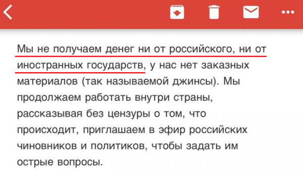 Однако мадам Синдеева лукавит: и джинса, и западное финансирование – в порядке вещей на «Дожде». О независимости канала речи и быть не может – связи с BBC давно стали достоянием общественности. Эта британская медиа корпорация финансируется правительством Соединенного Королевства и заинтересована в размещении на канале материалов, направленных на реализацию интересов Великобритании и дестабилизацию ситуации в России. Более того, «Дождь» получает деньги и от американского BBG – Совета управляющих по вещанию в США, транслирующего в Россию задачи, который ставит и оплачивает штатовский Госдепартамент.