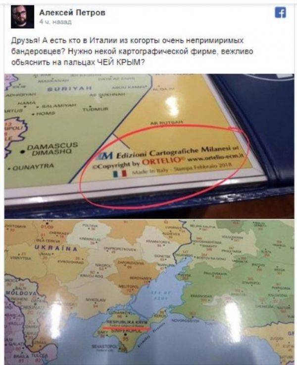 Украинские патриоты начали угрожать итальянцам и обзывать их фашистами за то, что на европейском ресурсе появилась карта мира с Крымом в составе России. Фотографию разместил пользователь Алексей Петров, который начал призывать украинцев, живущих и работающих в Италии к насилию против «пророссийских издателей».