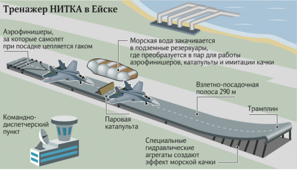 Минобороны приняло решение достроить учебно-тренировочный комплекс НИТКА в Ейске, рассказали в военном ведомстве. Работы будут завершены до конца года, после чего пилоты смогут в полном объеме отрабатывать там взлет с палубы авианосца и посадку на нее. Однако личный состав корабельных истребительных авиаполков продолжит тренировки в аналогичном комплексе в Крыму. А в Ейске будут готовить новые кадры и испытывать перспективную технику.