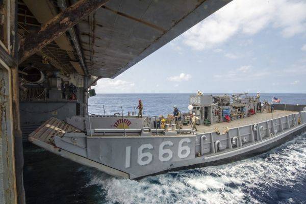 Именно такой десантный катер, запечатленный на фото входящим в доковую камеру десантного транспорта-дока «Ганстон-Холл», был поврежден во время недавнего шторма.
