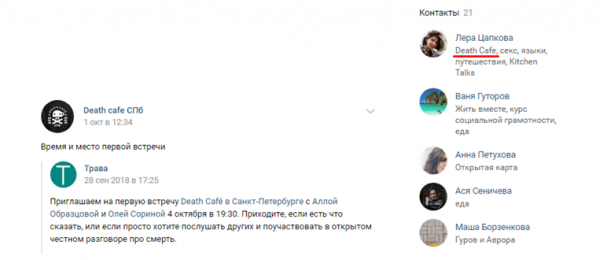 Death Cafe в Северной столице открыла Ольга Сорина, известная также по работе в НКО «Вдох» и в проекте «Трава». Еще одним куратором кафе является коллега Сориной по «Траве» Лера Цапкова. «Бумага» и «Трава» - как вам коннотации? Да эти цыпочки даже не скрываются, когда продвигают идею наркотизации молодежи!