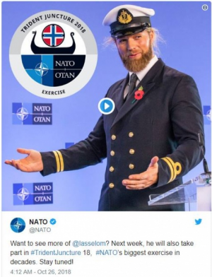 Дело в том, что аккаунты в соцсетях НАТО рекламирует лейтенант норвежского ВМФ Лассе Лёклен Матберг. Смотрится такая «реклама», конечно, довольно убого. Сами посмотрите, да еще и надпись «Хотите увидеть больше Лассе? На следующей неделе он примет участие в «Трезубце-18» — крупнейшем учении НАТО за десятилетия. Оставайтесь с нами!».