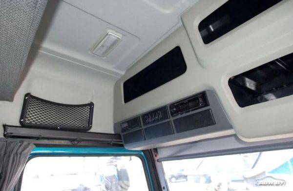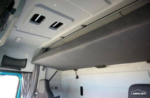 Для размещения вещей в кабине имеются два багажных отделения объемом 200 литров каждое, а также боксы на потолочной консоли и торпедо, ниши в дверях. В базовой комплектации - независимый воздушный отопитель кабины, кондиционер и холодильник.