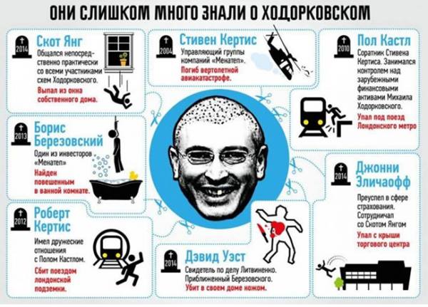 В Лондоне, где обосновался Ходорковский, убийства продолжились. Например, в 2004 году погиб Стивен Кертис, который занимался оффшорными операциями Ходора, а после ареста начал сотрудничать со спецслужбами Великобритании. Вначале ему за это угрожали расправой, а потом угрозы оказались реализованными.
