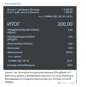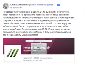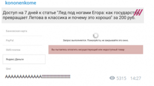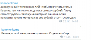 Так, журналист Максим Кононенко купил себе подписку на «Дождь», чтобы прочитать статью Кашина. Вот только после оплаты оказалось, что доступа к полной версии нужной ему статью нет, и для того, чтобы ее прочитать, нужно заплатить еще 200 рублей. Вот только в условиях о таком почему-то не написано.
