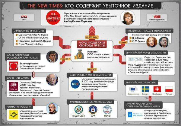 Самую крупную сумму (25 000долларов) перевел основатель фонда «Династия» Дмитрий Зимин, который и ранее финансировал журнал через оффшор, зарегистрированный, на Бермудах. Тут занятно, что фонд «Династия» признан иноагентом, и только за первое полугодие 2016 года The New Times получил от него более 12 млн рублей.