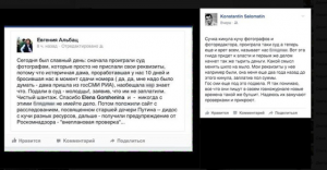 Так, например, в своем Фейсбуке Альбац решила посоветоваться о том, где покупать вино. То, что она давняя любительница алкогольных напитков, видно на фотографиях, где ее постоянным спутником является бокал. Ну, и это не говоря об общем внешнем виде Альбац и ее поведении: темные круги под глазами, плохая кожа, неадекватные высказывания.
