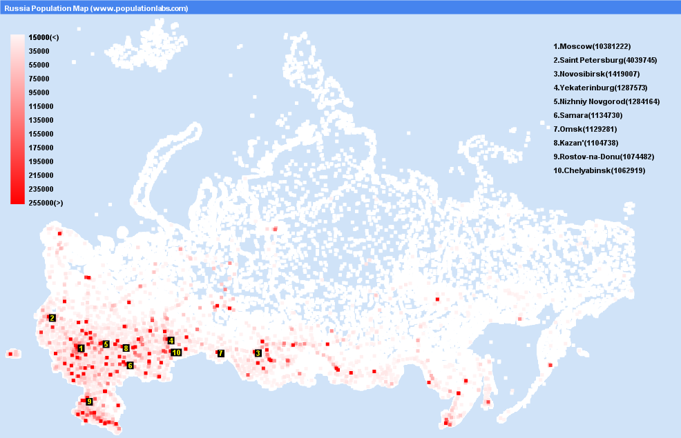 Согласно этой карте, десятка крупнейших городов выглядит так: Москва, Санкт-Петербург, Новосибирск, Екатеринбург, Нижний Новгород, Самара, Омск, Казань, Ростов-на-Дону, Челябинск.