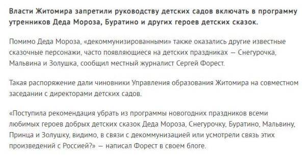 В этом году в житомирских детсадах запретили "Агентов Кремля" - Деда Мороза, Снегурочку, Буратино, Мальвину и Золушку. Дед Мороз и Снегурочка попали под запрет и в Харьковской области.Чем же не угодили украинским чиновникам Буратино, Мальвина, Золушка? Маразм и идиотизм доходит до каких-то фантастических умозаключений...че они там курят, что так боятся сказочных героев?