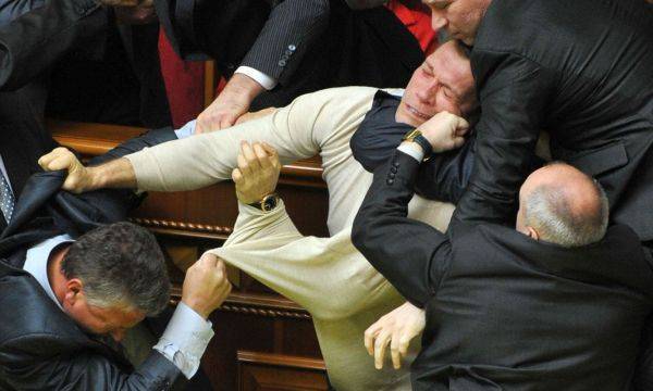 Депутат от фракции «Блок Петра Порошенко» Олег Барна и внефракционный депутат Юрий Левченко подрались в прямом эфире парламентского телеканала «Рада», запись инцидента опубликована на YouTube.