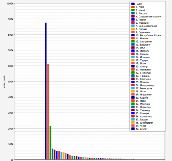 Конечно, кто-то возразит, мол как можно ставить в один ряд и сравнивать нашу страну и, скажем, Китай? Задающие этот вопрос забывают учесть одну маленькую особенность – Литва является одним из 29-и полноправных участников НАТО, со всеми вытекающими последствиями – общие траты, общий военный бюджет, и самое важное – нападение на одну из стран расценивается как нападение на весь блок. И наш президент, Даля Грибаускайте, при любом удобном случае напоминает нам об этом. А это значит, что в случае конфликта с одной из стран НАТО агрессору придется иметь дело с мощностями всего блока. Чтобы понимать насколько большая пропасть между передовыми странами не входящими в альянс и самим НАТО приведем несколько цифр. Военный бюджет Китая в настоящем году (2018) составит не многим более 170 млрд долларов. А теперь внимание - оборонные расходы НАТО перевалили за 1 трлн долларов, если кто-то не понимает, то это 1000 млрд долларов! Чтобы хоть как-то представить соотношение этих цифр приведем диаграмму военных расходов стран в 2016 году.