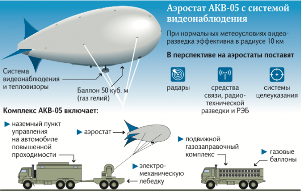 Вооруженные силы получат привязные аэростаты нового поколения. Официальное название комплексов — АКВ-05. Они были испытаны в Сирии — на базе Хмеймим и во время операции по освобождению Пальмиры. Аэростаты с системой видеонаблюдения и тепловизорами планируется использовать для охраны важных военных объектов. Первая партия обойдется военным в 120 млн рублей. По мнению экспертов, комплексы станут универсальными носителями для высокотехнологичных наблюдательных систем.