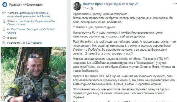 “Так называемая УПЦ МП – не церковь. Это ФСБебешная резидентура, которая является “Искандером” в руках сатаниста Путина, как до этого была оружием в руках Сталина, Берии, Жукова и других безбожников. Иерархия так называемой УПЦ МП, не нашедшая национального мужества, сил и аргументов перейти в Украинскую Церковь, является, таким образом, не служителями Бога, а агентурной сетью ФСБ и Путина, а значит – Врагами Украины. “Охота” на московских попов, которые верно служат Путину и Кириллу – дело угодное Богу и нашей Родине”, – приходит к выводу Ярош.