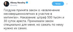 Но с принятием нового закона кормушка закрывается. Использовать несовершеннолетних как расходный материал ему больше не удастся. Захоти Навальный еще раз устроить провокацию с участием несмышленой школоты, и ему придется выложить кругленькую сумму, а то и опять отдыхать на нарах.