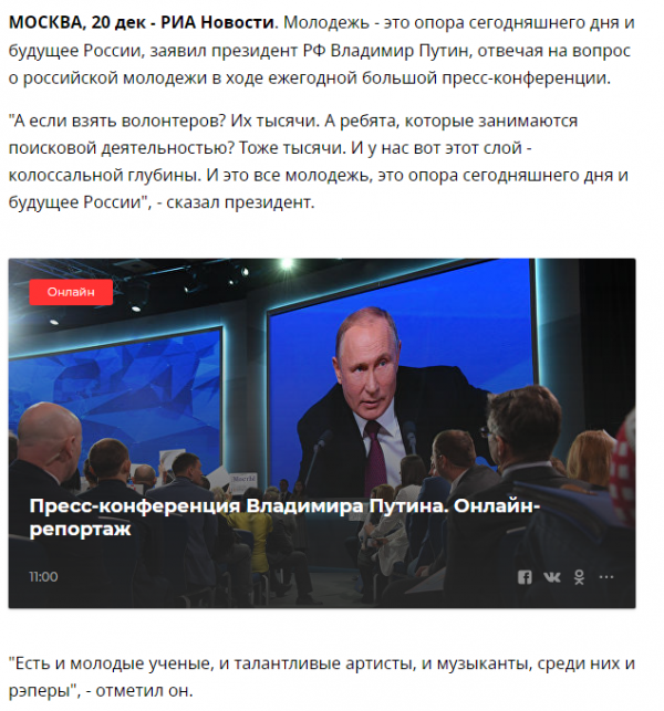 Сегодня на ежегодной большой пресс-конференции Путин назвал молодежь опорой сегодняшнего дня и будущим России.