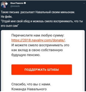 Так что Навальный всегда и на всем пытается заработать. Этических граней при этом у него нет ни капли. Еще во время своей так называемой предвыборной кампании он понимал, что его не зарегистрируют в качестве кандидата на выборах. Именно поэтому и придумывал разного рода лохотроны, среди которых был и СЫЧ. Сейчас Леша делает то же и будет продолжать в том же духе, если его самого не арестуют.