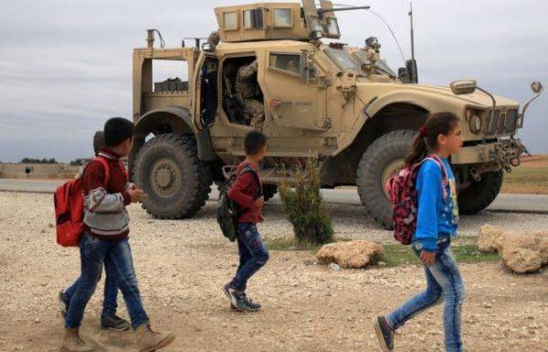 Сирийские школьники проходят мимо американского военного патруля вблизи турецкой границы в городе Хасаки, Сирия, 4 ноября 2018 года