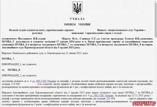 В нем отмечается, что «Приговором Ленинского районного суда г. Кировограда от 23 июля 2013 ЛИЦО_7 и ЛИЦО_8 осуждены по ч. 4 ст. 368-3 УК Украины (редакция от к штрафу в размере десяти тысяч необлагаемых минимумов доходов граждан, что составляет 170 000 (сто семьдесят тысяч) гривен с лишением права занимать руководящие должности, связанные с организационно-распорядительными и административно-хозяйственными функциями на 1 год, с конфискацией всего имущества, являющегося их собственностью».