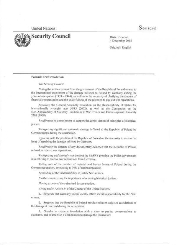 Если эта резолюция будет хотя бы рассмотрена Совбезом, то сразу возникнет толпа желающих пересмотреть невыгодные для них итоги "дел давно минувших лет". И вскоре резолюции Совбеза и Генассамблеи ООН об исторической ответственности превратятся в привычный инструмент для вымогательства и шантажа, заменяющий собой общепринятое международное законодательство и перекраивающий историю по образцу, удобному для заявителей. Тогда такие любители многократно нагреть руки на одних и тех же событиях, как Польша, получат индульгенцию на пополнение государственного бюджета за счет старых обид. Сначала претензии к Германии, потом еще раз припомнят Рижский мир России, Виленский край Литве и множество обид Украине от Волыни до Коливщины. Не исключено, что следующей резолюцией будет требование пересмотра разделов Речи Посполитой и возвращения всех территорий, принадлежавших Польше до Венской конвенции 1772 года и воплощение "Ягеллонской идеи".