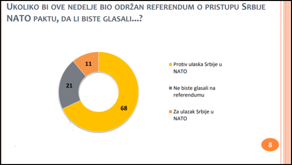 Согласно исследованию «Евроатлантическая интеграция и диалог между Приштиной и Белградом», если бы в стране прошел референдум о присоединении к НАТО, 68% граждан были бы против, 11% – за и 21% – предпочли бы оставить свое мнение при себе.
