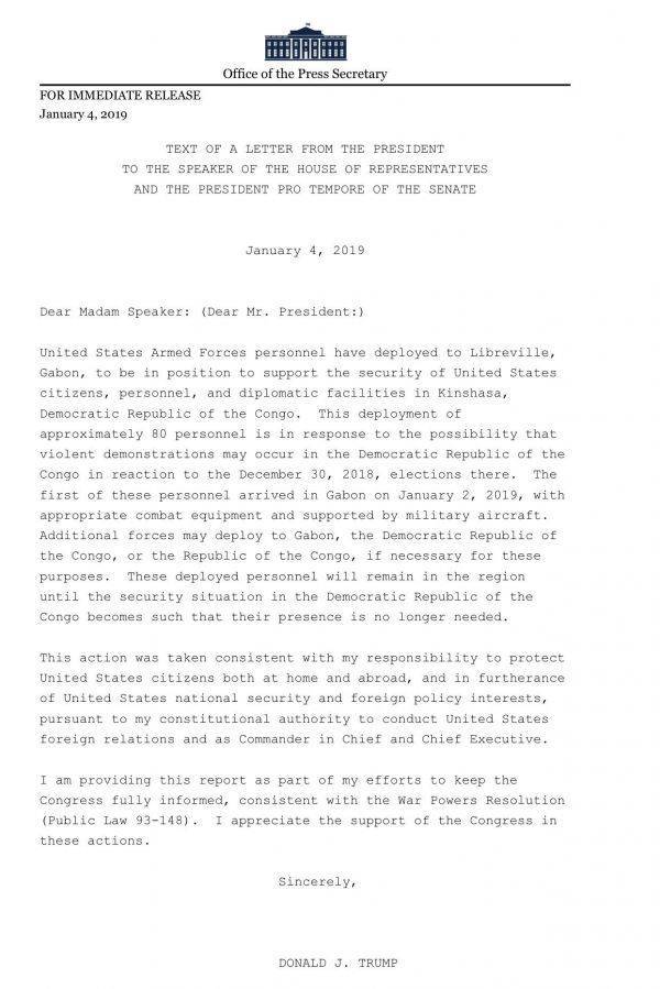 Трамп подписал приказ о развертывании американского контингента в Габоне для обеспечении безопасности американцев в Демократической Республике Конго, где начались массовые беспорядки.