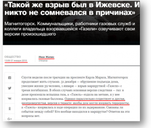 В частности, это пытается сделать спецкор «НГ» Иван Жилин. Только 6 января его уличили в распространении фейка о том, что якобы два магнитогорских взрыва связаны между собой и являются результатом действий террористов. Однако, несмотря на это, уже на следующий день он опубликовал новый материал на эту тему.