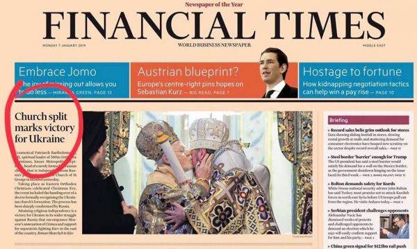 И транснациональная Financial Times победно проговорилась о том, что «победа Украины», дескать, достигнута – путём «церковного раскола».