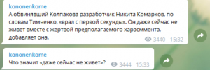 А журналист Максим Кононенко обвинил во лжи тех, и других, заявив, что та же , Тимченко заявляла, что Комаров врет касательно харассмента по отношению к своей жене.