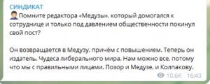 Впрочем, лживый подход и «Проекта», и «Медузы» «оценил» и многие другие. Так, к примеру, прокомментировали все это на одном из телеграм-каналов: