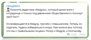 Отметим, что это уже десятый сотрудник, которого обстановка, сложившаяся в редакции, вынудила искать другое место работы. За последние несколько месяцев с «Медузой распрощались, в частности, корреспондент Евгений Берг, журналист и дизайнер Екатерина Кронгауз, спецкор Полина Еременко, продюсер Анна Будзяк, спецкор Андрей Борзенко.