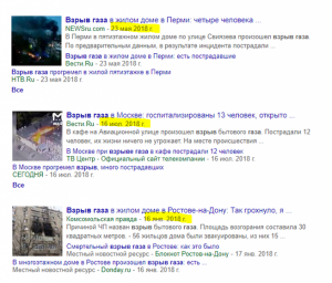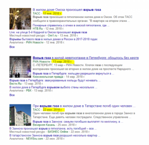 Наконец, чтобы было более наглядно, покажу скрины новостной выдачи за первые несколько месяцев 2018 года, которая доказывает, что взрывы газа, к сожалению, не редкость. Но только когда журналисты намеренно вас запугивают, эти взрывы приобретают «особые оттенки»: