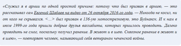 Во-вторых, сведения об участии в чеченской кампании появились от Шабаева в 2013 году. А до этого он заявлял, что был помощником депутата Госдумы ФС РФ Расуля Шугурова. Что, впрочем, тоже махровая ложь.