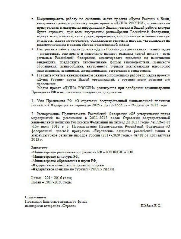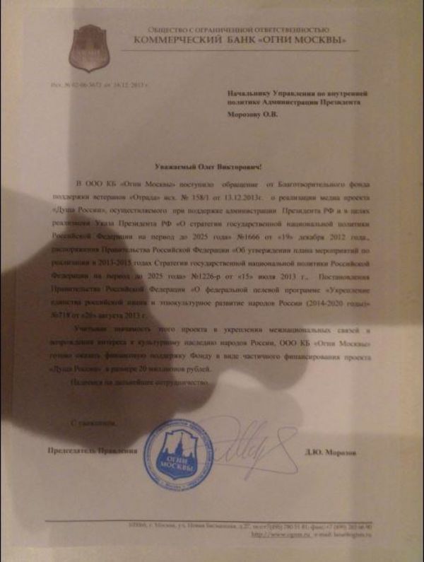 На «Отраде» «комбинатор» не остановился и замутил крупнейшую из всех своих афер – патриотический медиа-проект «Душа России». Это название идентично реальной премии Правительства РФ, присуждаемой за вклад в развитие народного творчества. И опять этот проект якобы одобрили инстанции, упомянутые выше. Причем разные спонсоры получали разный набор ведомств, а также различные суммы, требующиеся на реализацию задумок. Судя по всему, Шабаев работал по стандартной схеме, обещая потенциальным вкладчикам целевое финансирование из госбюджета. На данной фотографии указано, как банк «Огни Москвы» готов был помочь фонду «Отрада», частично профинансировав «Душу России».