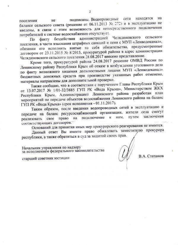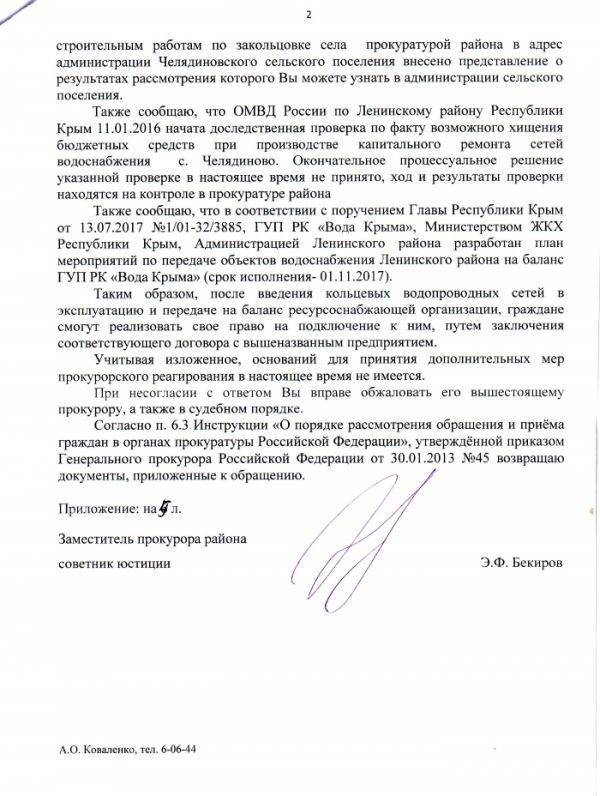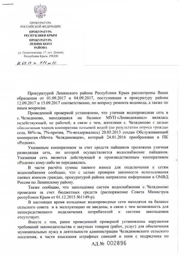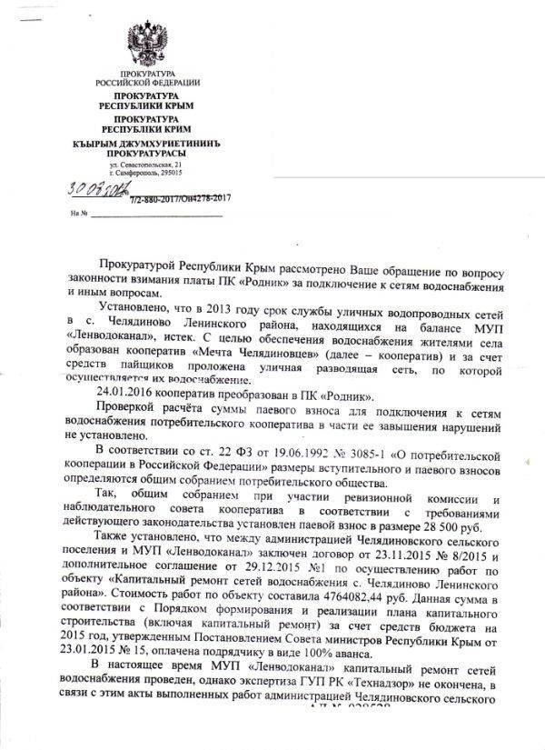 По данным прокуратуры и министерства ЖКХ Крыма, принять в эксплуатацию новую «закольцовку» можно только вместе с разводящими сетями кооператива «Родник». Между тем, проектом по капитальному ремонту водопроводных сетей не предусматривалось подключение к сети абонентов, не являющихся членами ПК «Родник».