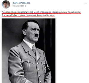 Но это, можно сказать, еще цветочки. Среди соратников Навального есть даже поклонники Гитлера. Один из них, Сергей Смирнов – работает ведущим на канале Навальный Live, а другой – Виктор Распопов, является членом свердловского регионального совета незарегистрированной партии Навального «Россия будущего».