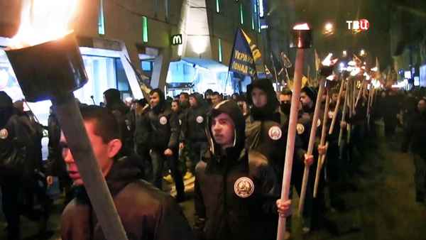 Смотрите внимательно на горящие глаза и пламенные сердца этих последователей УПА, с «Бандерой в башке», с факелом в руке, собрав весь исторический символизм католической «Святой инквизиции», маршей германских нацистов, бодро и весело шагают они под «кричалки» и лозунги по улицам Киева. Какую «скверну они ищут» или стараются найти? Назвать? Это все советское, коммунистическое прошлое Украины, общее прошлое с Россией. Прочь от прошлого вперед в «счастливое европейское будущее»! В Европу и НАТО!