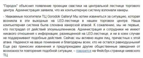 А уже в понедельник вечером, 18 февраля, через два дня, торговый центр сообщил, что ступеньки взломали хакеры... т.е. два дня они не замечали, что у них творится, а после того, как это выложили в интернет, то заявили, что "ступеньки взломали хакеры"...